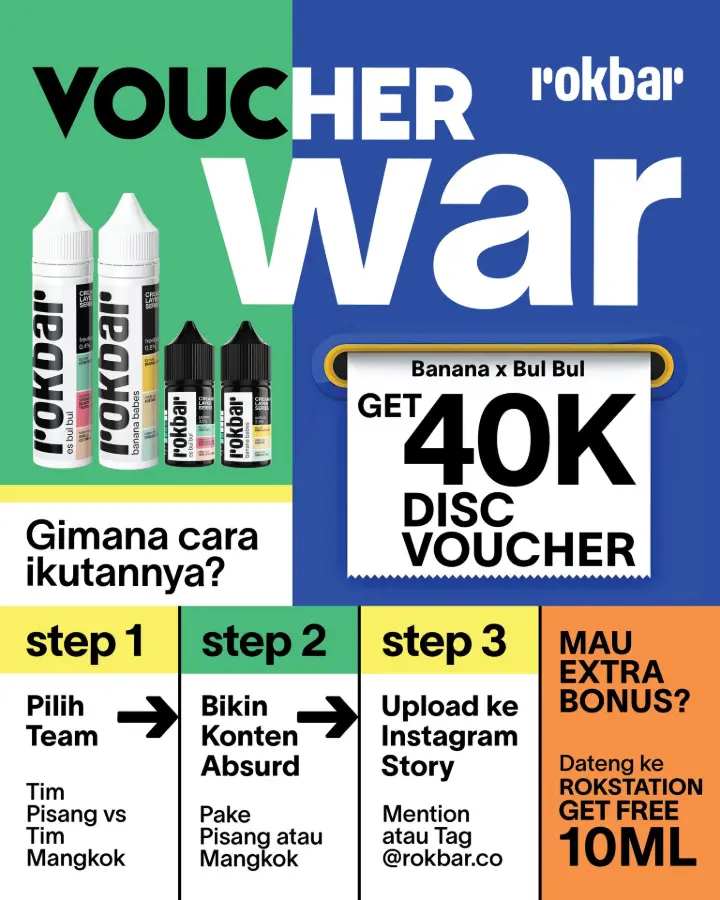 Dalam rangka meluncurkan varian terbaru yaitu Banana Babes dan Es Bulbul Freebase Rokbar bagi-bagi voucher diskon Rp40.000 yang bisa dipakai online maupun offline di SELURUH TOKO VAPE di Indonesia.